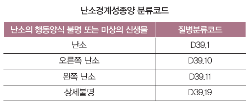 일상생활에서 지속적인 통증은 일이나 공부를 할 수 없게 만들고, 악성종양일 경우 구토나 자궁출혈 등 심각한 상황을 일으키기 때문에 매우 엄중하게 치료해야 한다. 경계선종양은 질병코드 D39.1에 속하는데, 보험금 분쟁이 발생하는 이유는 질병분류코드가 D37~48로 보험회사는 일반적으로 보험금의 30%만 강제적으로 지급할 수 있기 때문이다.명시되어 있기 때문에