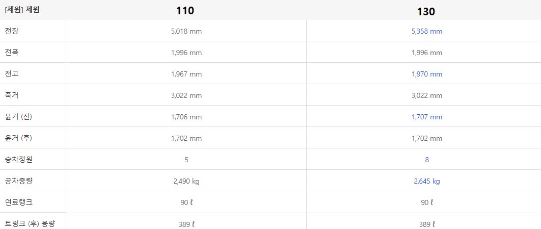 110과 130의 경우 차량 공차 중량의 차이는 약 150kg이고 길이는 약 35cm입니다.