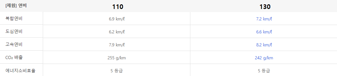 연비는 110보다 130이 더 좋습니다. 아마도 130의 차체 크기가 커지고 무게도 늘었음에도 불구하고 130의 연비가 더 좋아보여서 최종 감속 설정을 더 크게 한 것 같습니다. (확실하지 않다).