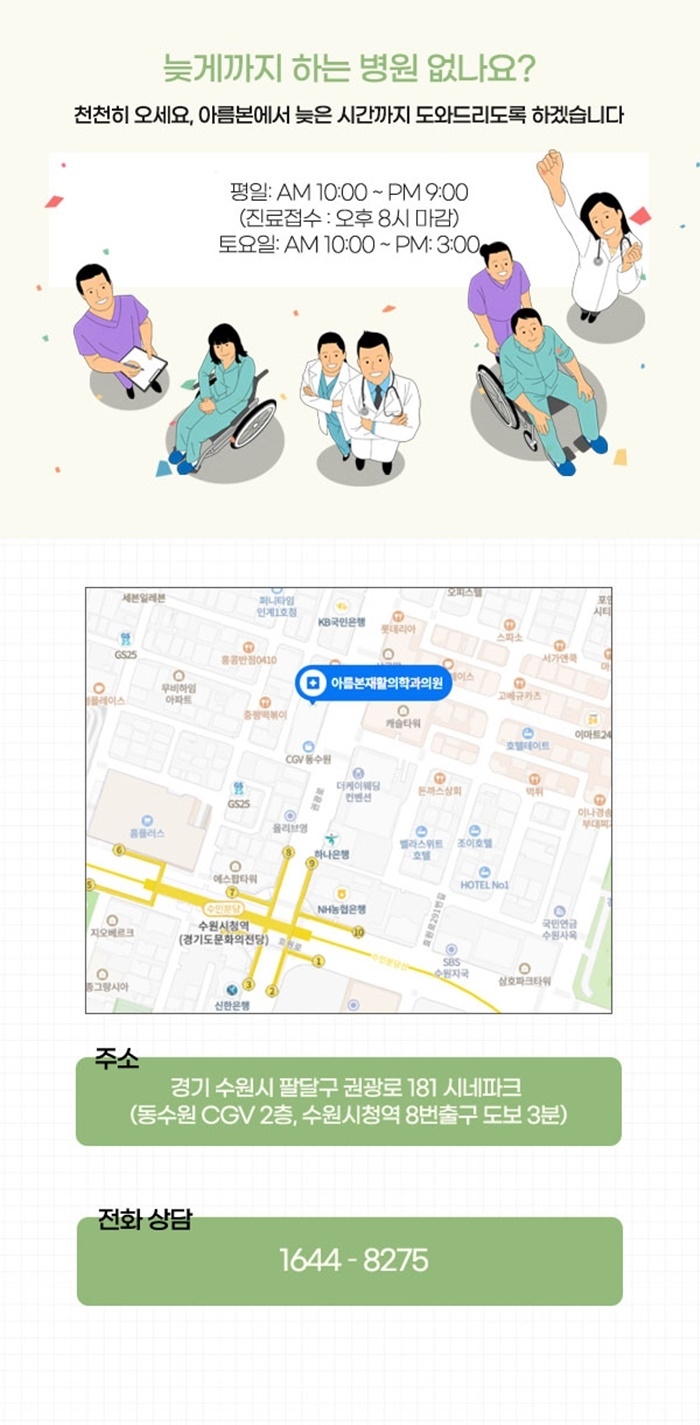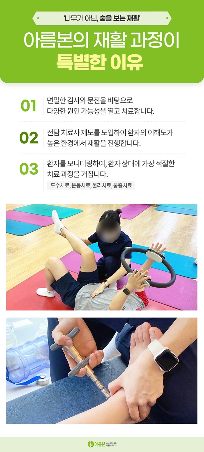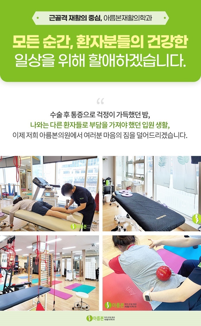 그렇기 때문에 무릎 수술이나 근골격계 질환 치료 후 재활이 필요하시다면 수원정형외과 아름본재활의학과를 찾아주세요.