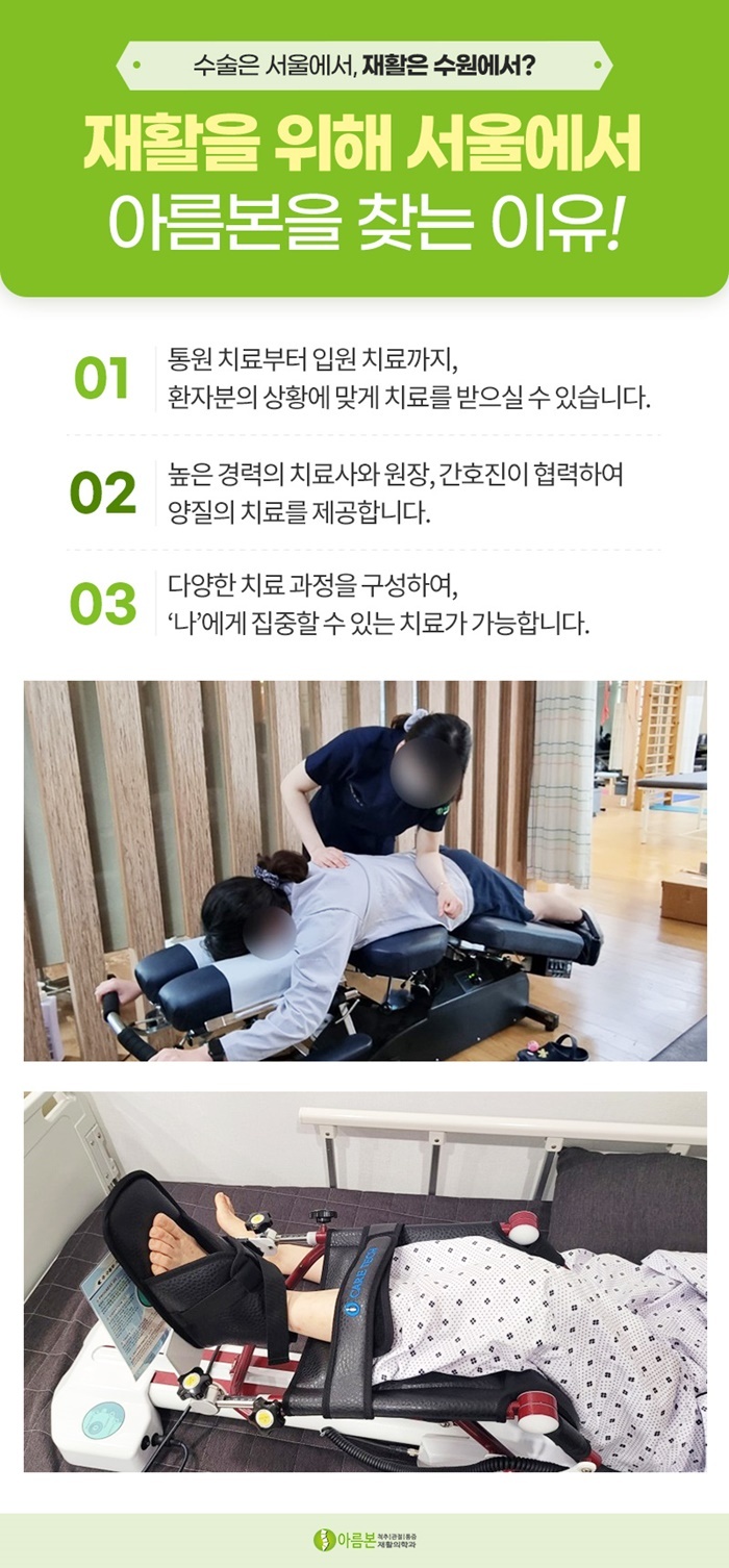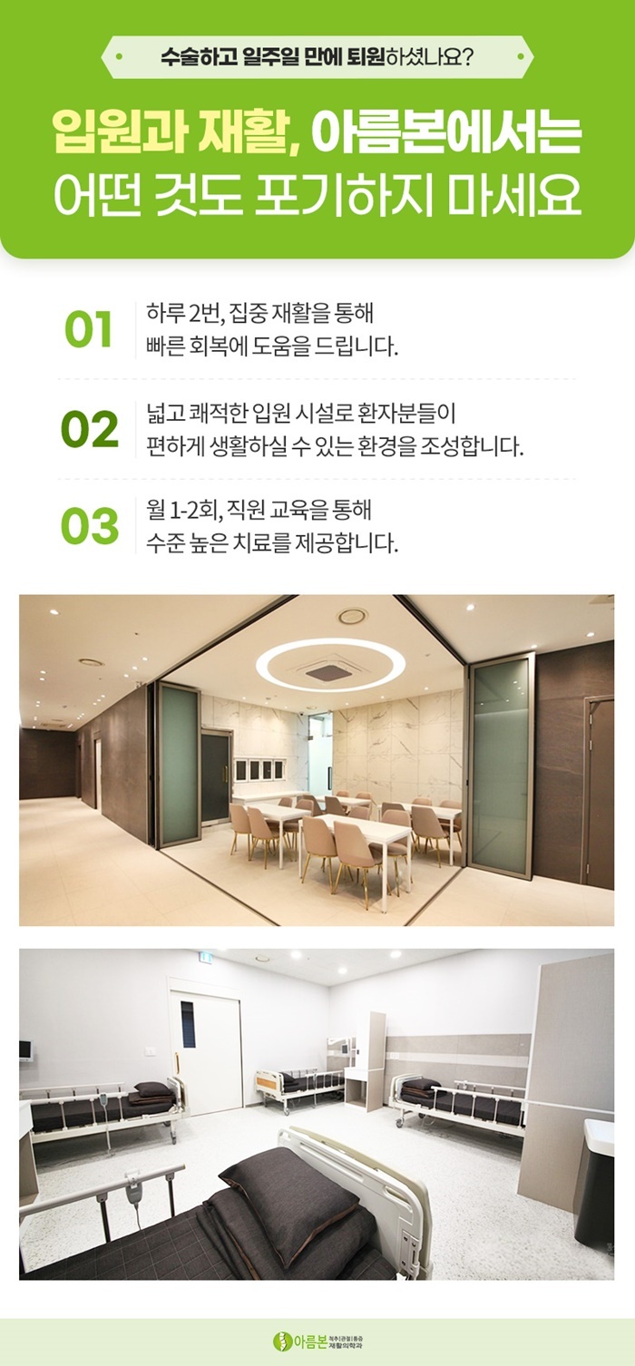 따라서 수원정형외과 아름다운본재활의학과에서는 외래진료와 입원치료가 병행되는 환경을 조성하여 상황에 맞는 적절한 치료과정을 선택할 수 있도록 하여 이러한 환자분들의 불편함을 덜어드리고자 합니다.
