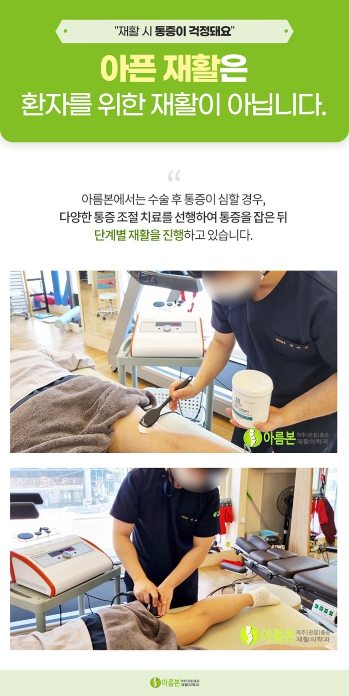 수원정형외과 아룸본재활의학과에서는 재활 중 이렇게 심한 통증을 느끼는 것은 환자를 위한 치료가 아니라고 생각합니다.