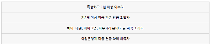 특성화고 1년 이상 재학 중인 자, 미용 전공 2년 이상 수료한 자