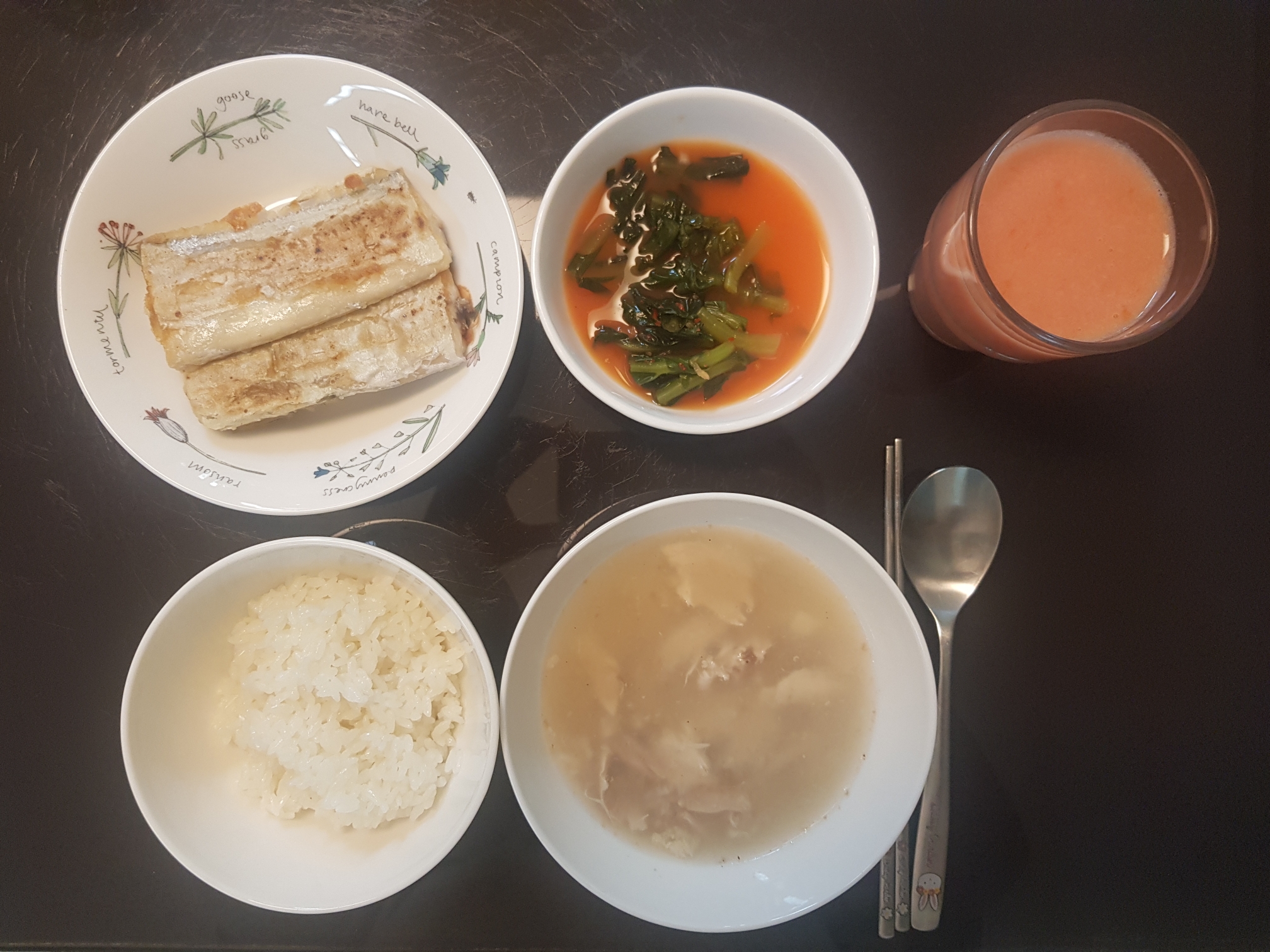 4월 17일 아침: 흰밥, 닭곰탕, 열무김치, 바삭한 갈치구이, 사과토마토주스