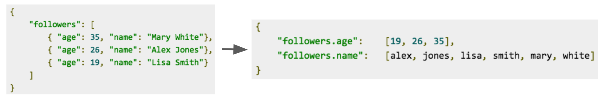 다양한 분야가 있습니다 단일 값 또는 다중 값(배열)오프로드도 가능 값이 비어 있거나 개체를 포함합니다.당신은 할 수 있습니다. Elasticsearch의 문서는 키-값 쌍 목록구성됩니다. 내부 개체 내의 필드는 해당 개체의 경로를 통해 액세스할 수 있습니다. (예: 사용자 이름.완성)