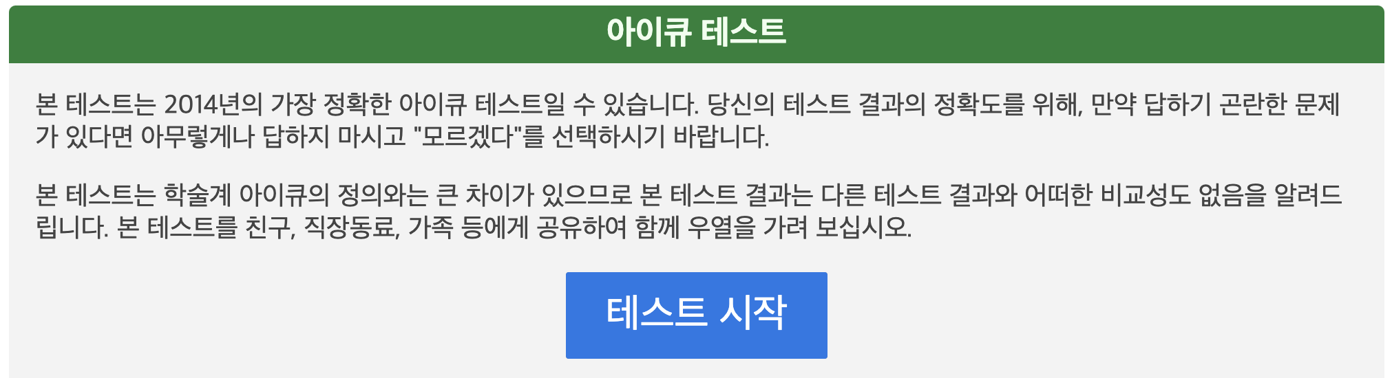 다음 URL에서 쉽게 IQ 테스트를 치를 수 있습니다. 연결 후 (테스트 시작) 버튼을 클릭하여 IQ 테스트를 시작합니다.