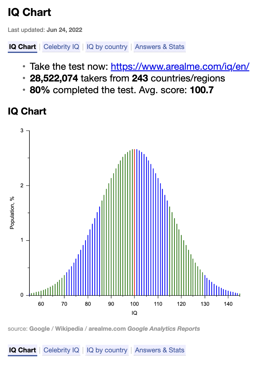 일련의 작업을 모두 해결한 후 IQ 지수는 다음과 같이 파생됩니다. 내 IQ에 대한 표도 사용할 수 있습니다. 등 다양한 정보가 제공됩니다. B. 세상에 몇 명이나 속해 있는지, 몇 퍼센트에 속해 있는지 등. 그래서 재미로 IQ 테스트를 해 볼 만하다고 생각합니다.